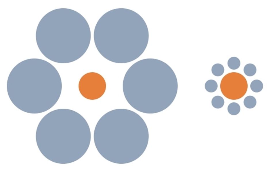 चित्रमा तपाईले देख्नुहुनेछ कि बीचमा सुन्तला सर्कलहरू छन् र वरिपरि नीलो सर्कलहरू देखिन्छन्। हेर्दा पहिलो तस्विरमा सुन्तलाको घेरा सानो र दोस्रो तस्विरमा ठूलो छ जस्तो लाग्छ । तर वास्तविकता यो हो कि दुबै तस्विरमा सुन्तलाको गोला एउटै साइजको छ। यसको वरिपरि निलो घेराको आकार बढेको वा घटेको छ, जसको कारण यसको आकारमा परिवर्तन भएको छ। यस्तै भ्रम चन्द्रमामा पनि हुन्छ। जब यो रातको अन्त्यमा माथि पुग्छ, तब यसको आकार उस्तै देखिन थाल्छ।