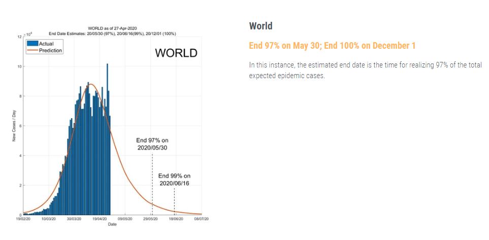 अन्वेषकहरूले ISR (अति संवेदनशील-संक्रमित-पुनःप्राप्त) मोडेल https://ddi.sutd.edu.sg/when-will-covid-19-end/ प्रयोग गरी महामारीको जीवन चक्रको अन्त्य हुने भविष्यवाणी गरेका छन । विश्वभरिका कोरोना संक्रमित बिरामीहरूको डेटा हाम्रो वेबसाइटबाट विश्वमा लिइएको थियो । यस गणितिय मोडेलिटिको माध्यमबाट विश्वविद्यालयले भविष्यवाणी गरेको छ कि विश्वभरिका कोरोना भाइरस मे २१ सम्म ९७ प्रतिशत र ८ डिसेम्बर २०२० सम्म १०० प्रतिशतको अन्त्य हुनेछ । यद्यपि बहाराइन र कतार लगायतका केही देशहरूमा २०२१ फेब्रुअरीसम्म कोरोनाका नयाँ घटनाहरू देखा पर्न सक्छन् ।
